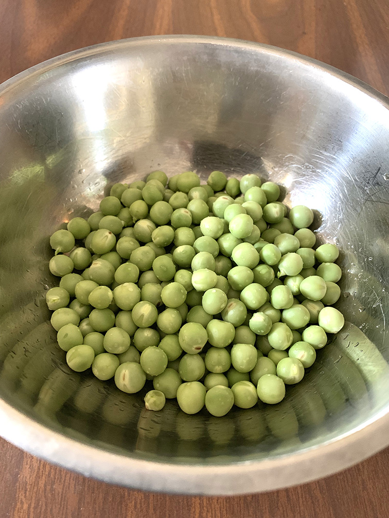 今回作った分量は、うすいえんどう(さやに入っている状態で200gぐらい)と米(2合)で炊きました。豆は少し固めに茹でました。